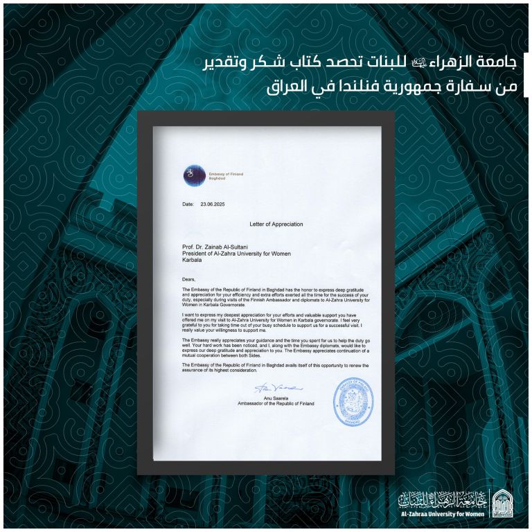 في إطار العلاقات الأكاديمية والدبلوماسية المتقدمة، تلقت جامعة الزهراء للبنات كتاب شكر وتقدير من سفارة جمهورية فنلندا في بغداد، أعربت فيه سعادة السفيرة الفنلندية لدى العراق، السيدة “أنو ساريلا”، عن بالغ امتنانها لما قدمته الجامعة من تعاون مثمر وحفاوة استقبال خلال الزيارة الرسمية التي أجرتها إلى محافظة كربلاء المقدسة في الشهر المُنصرم.