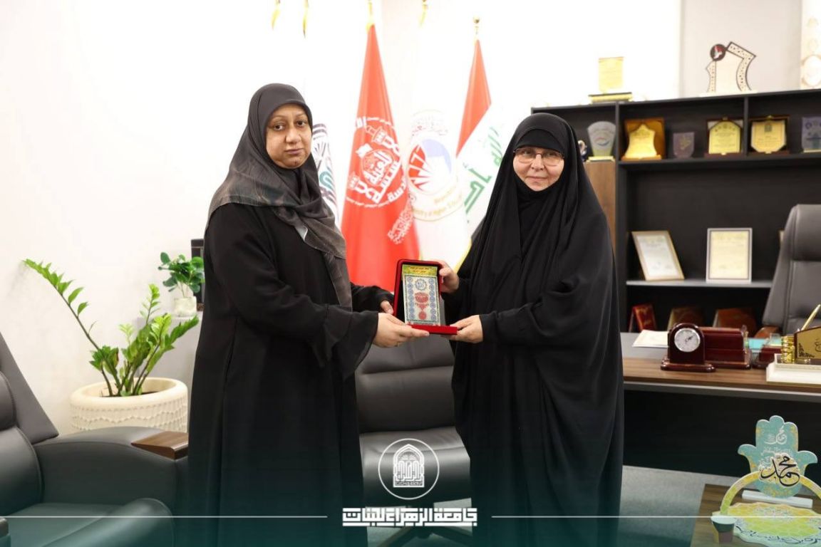 وكان في استقبال الوفد السيدة عميد كلية الصيدلة، أ. د. نور هاتف الدباغ، والسيدة م. د. عائدة عبود حسين مديرة قسم النشاطات الطلابية، وقد جرى تكريم الطالبة بدرع دار القرآن الكريم، وتولت التكريم الأستاذة نجوى، المشرفة الأكاديمية التي أشرفت على تدريب الطالبة وإعدادها في مجال الحفظ الموضوعي.