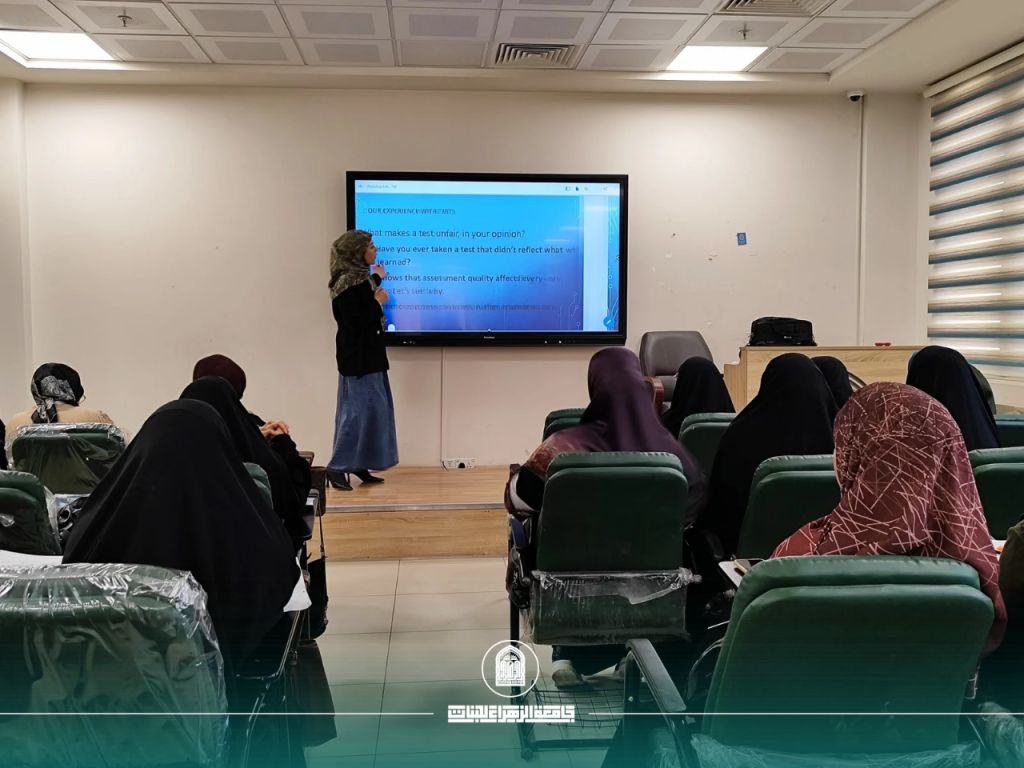 وقدّمت الورشة م.م زهراء إياد عبد الأمير، وشهدت مشاركة فاعلة من أساتذة وطالبات قسم اللغة الإنكليزية، ضمن إطار تعزيز الأنشطة العلمية الهادفة إلى تنمية المهارات الأكاديمية والتربوية.