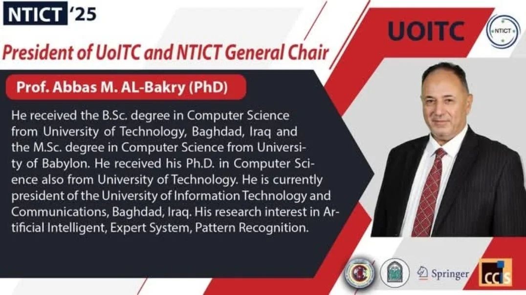 من أبرز المتحدثين في "المؤتمر الدولي التاسع التوجهات الحديثة في تطبيقات تكنولوجيا المعلومات والاتصالات"، السيدة رئيسة جامعة الزهراء (ع) للبنات أ. د. زينب السلطاني ورئيس جامعة تكنولوجيا المعلومات والاتصالات أ. د. عباس محسن البكري إضافة إلى عدد من البتححثين والأكاديميين من داخل العراق وخارجه.