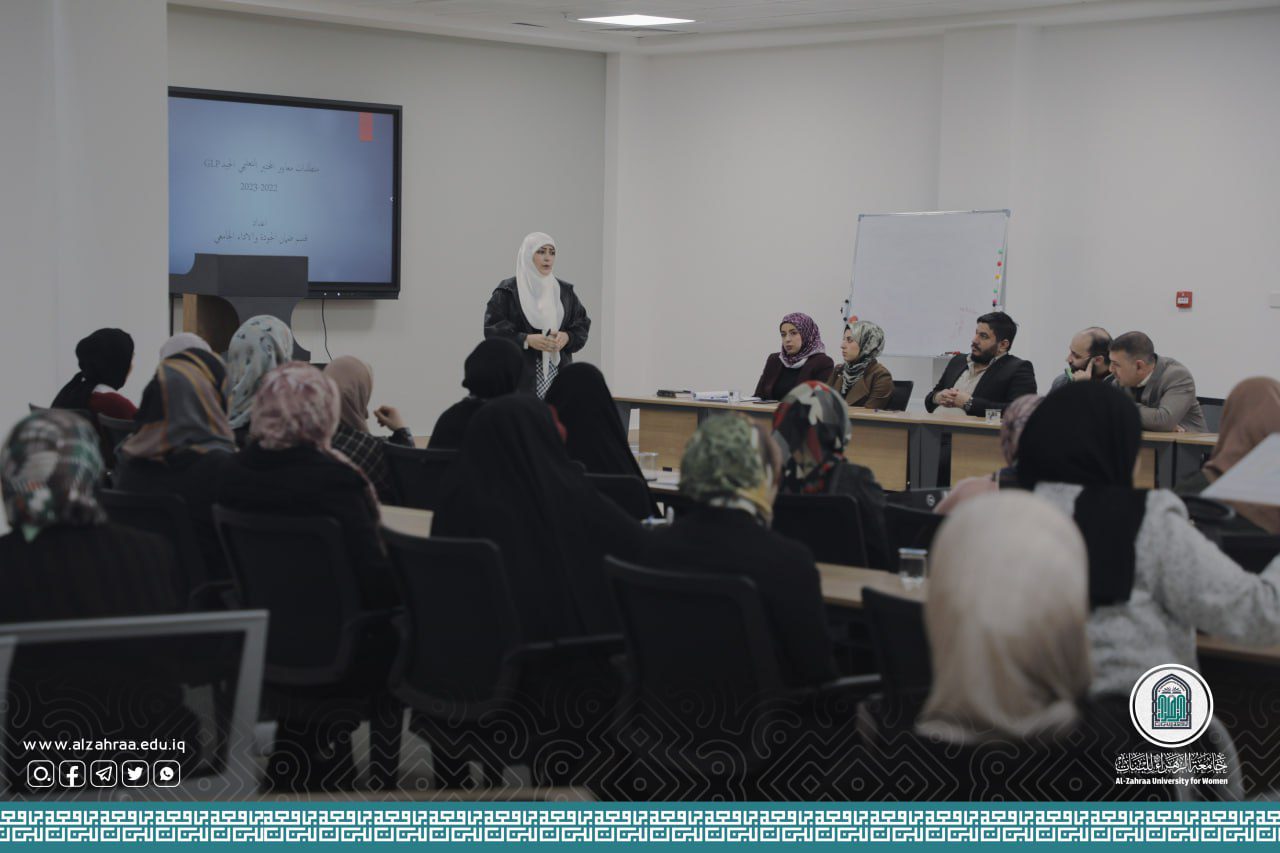 أقام قسم ضمان الجودة والأداء الجامعي بالتعاون مع قسم التعليم المستمر في جامعة الزهراء (عليها السلام) للبنات ورشة عمل بعنوان: (مواصفات المختبر الجيد الــ(GLP قدمتها المدربة الأستاذة: م.م حوراء كريم محمد، والمهندسة: هدى زهير علي، يوم الأربعاء الموافق: 18/1/2023، في تمام الساعة 11 صباحًا، على رحاب قاعة مركز الكوثر للتعليم المستمر.