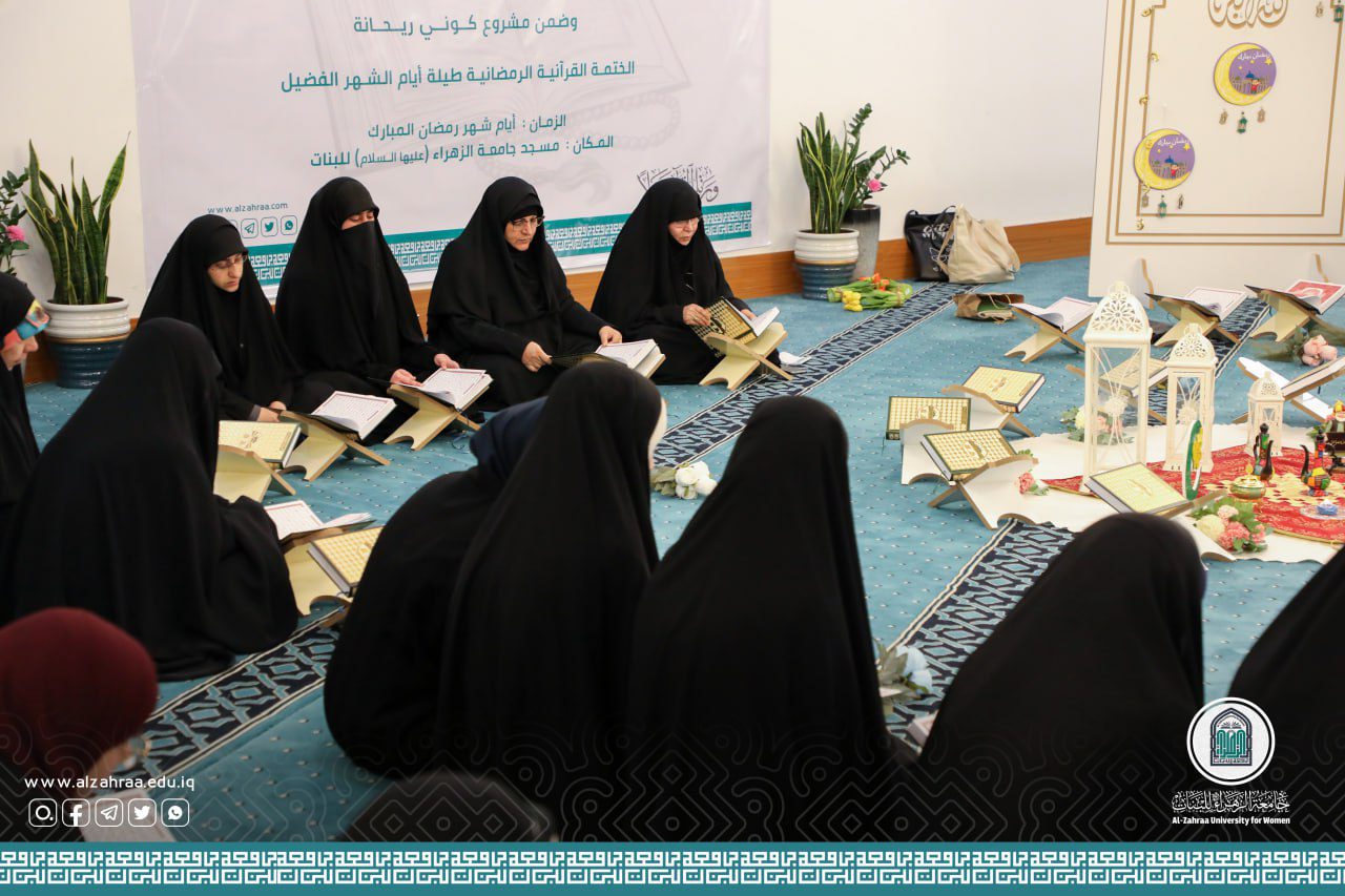 انطلاقاً من رؤية جامعة الزهراء (عليها السلام) للبنات وسعيها في تبني ورعاية الفعاليات والنشاطات الدينية ولاسيما القرآنية التي تزداد أهميتها في شهر رمضان المبارك، أقام قسم النشاطات الطلابية في جامعة الزهراء (عليها السلام) للبنات وبالتعاون مع دار القرآن الكريم في العتبة الحسينية المقدسة الختمة القرآنية الرمضانية طيلة أيام الشهر الفضيل، وذلك ضمن مشروع: (كوني ريحانة)، على مسجد جامع الزهراء (عليها السلام)، ابتدأت الختمة يوم الخميس الموافق 23/3/2023، في تمام الساعة 10:30صباحاً.
