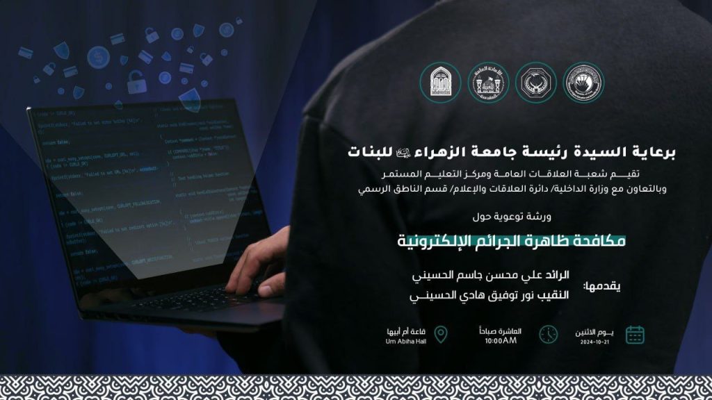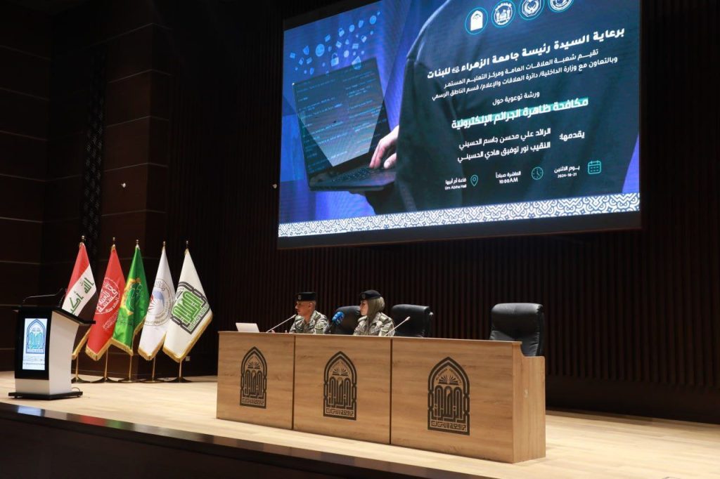 برعاية السيدة رئيسة جامعة الزهراء (عليها السلام) للبنات أ.د. زينب الملا السلطاني اقامت شعبة العلاقات العامة ومركز التعليم المستمر بالتعاون مع وزارة الداخلية العراقية/دائرة العلاقات والاعلام/قسم الناطق الرسمي ورشة توعوية بعنوان "مكافحة ظاهرة الجرائم الالكترونية"، قدمها كل من السيد الرائد علي محسن جاسم الحسيني والسيدة النقيب نور توفيق هادي الحسيني.