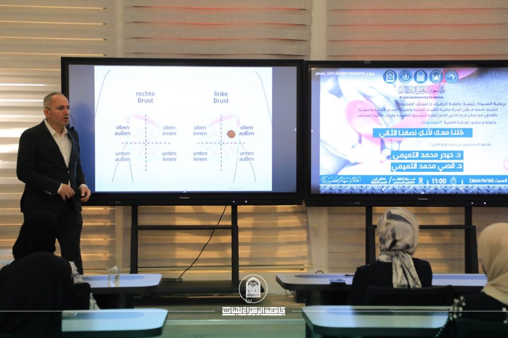 وقدم المحاضرة د. حيدر التميمي من مركز أورام الثدي التابع للعتبة الحسينية المقدسة، وقد بين أنواع الفحص ورتبها أفضل الطرق للفحص حسب نوع الحالة، كما شدد على أهمية الفحص المبكر، كما أجاب على أسئلة الحاضرين.