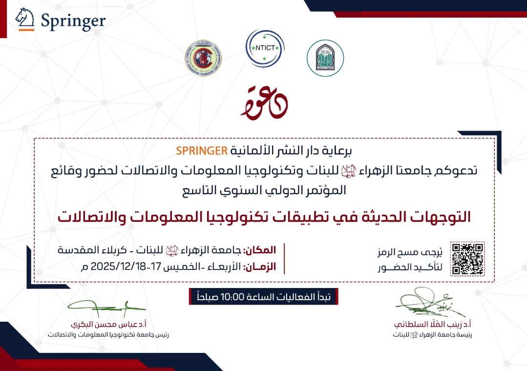 Welcoming First-Year Students for the Academic Year 2025-2026 Honoring the top female students in the college College editorial College News Department News Department News College News College News College News Division of Women's Affairs Department of Art Education Department of Special Education Department of Therapeutic Nutrition Communications and Mobile Computing Engineering Cybersecurity Engineering Artificial Intelligence Engineering Department of Radiologic Technology Physiotherapy Techniques Department Arabic Language Department English Language Department Mathematics Department Engineering and Information Technology Faculty Education Faculty Conferences Health and Medical Technologies Faculty Pharmacy Faculty Department of Quality Assurance Department for Diwan Affairs Department of Student Activities Department for Legal Affairs Electronic Computer Center Continuous Learning Center Media Department Department of Construction and Projects Department of Campus Dormitory Affairs Central Library Holy Shrine of Imam Hussain visits Training and Employment