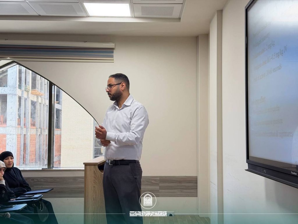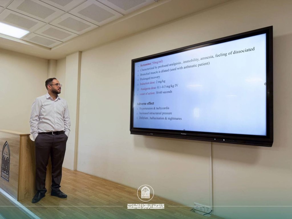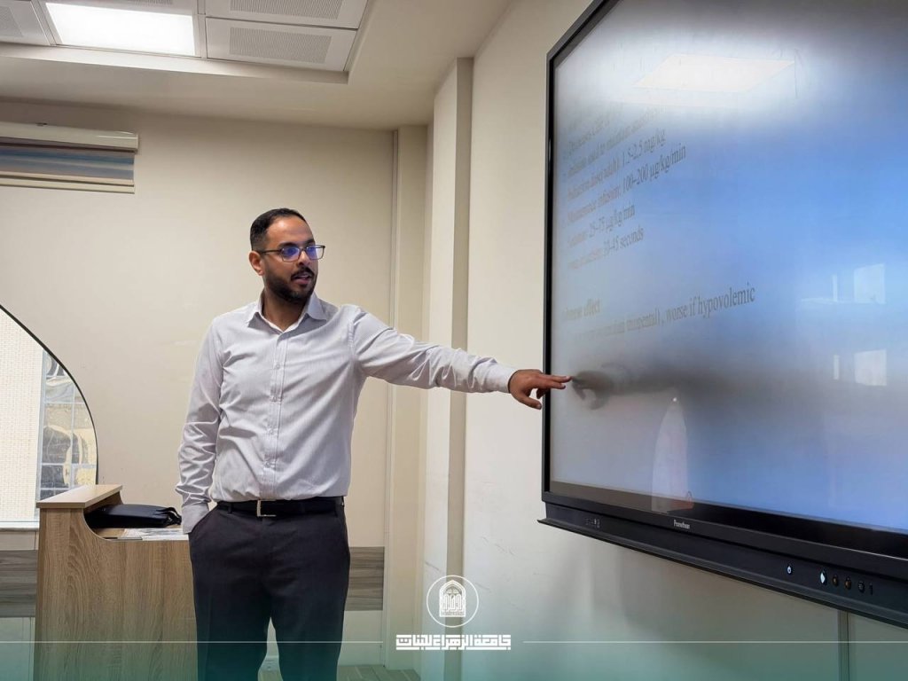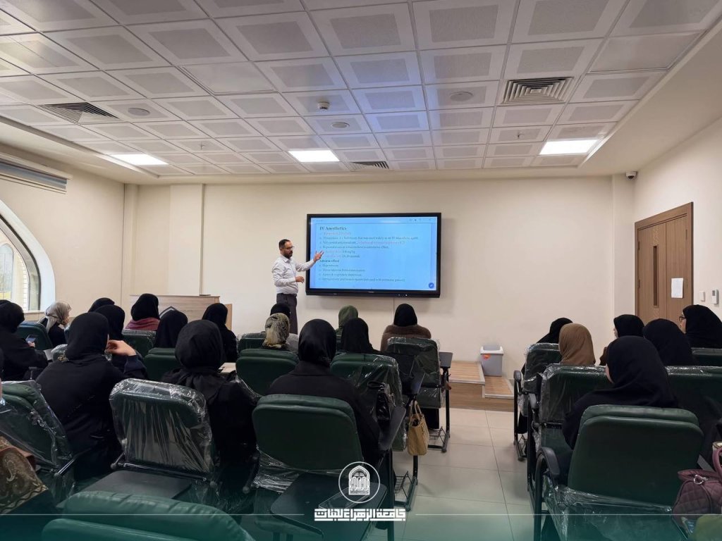 Under patronage of President of Al-Zahraa University for Women, Prof. Dr. Zainab Al-Sultani, and supervision of Dean of College of Health and Medical Technologies, Assist. Prof. Dr. Ali Al-Khafaji, Department of Anesthesia Techniques organized a scientific workshop titled “Preparation of Intravenous Anesthetic Drugs.” The workshop was delivered by lecturer Dr. Saifullah Hossam Ghazi.
