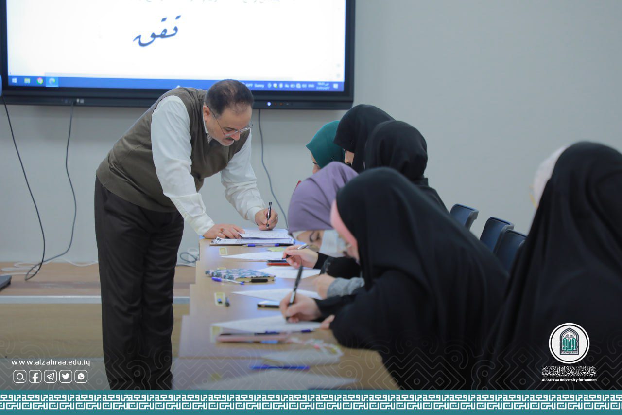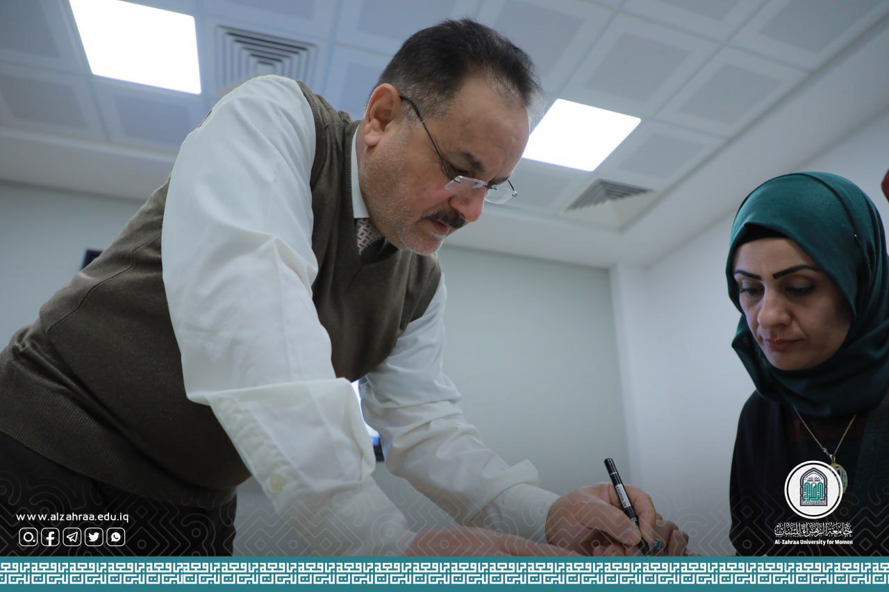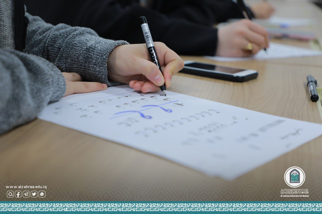 The College of Education/Department of Arabic Language at Al-Zahra University for women, in cooperation with the Department of Continuing Education, held a training course entitled: (Improving Arabic Calligraphy with an Ordinary Pen) presented by Prof. Dr. Hamid Yacoub Naima, for a period of three consecutive days, at (9 am) in the morning, at Al-Kawthar Hall for Continuing Education.