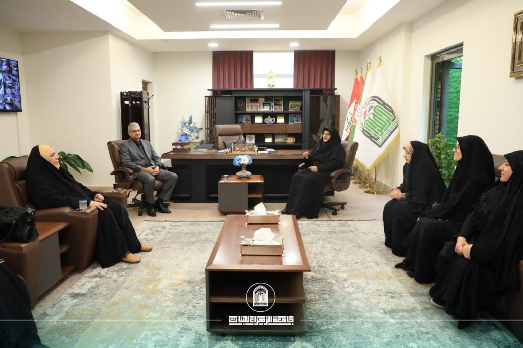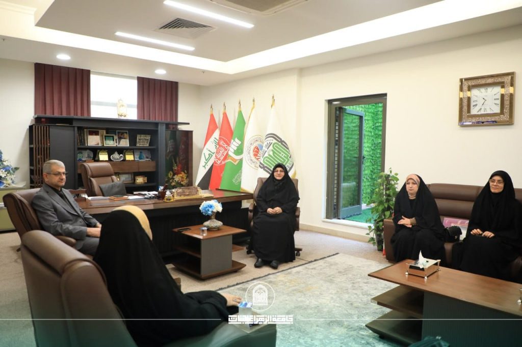 A delegation from Maysan University consisting of such members as deans of faculty and teaching staff arrived at Al-Zahraa University for women. The delegation was welcomed by Prof. Dr. Zainab Al-Mulla Al-Sultani, President of the University as well as senior staff members.
