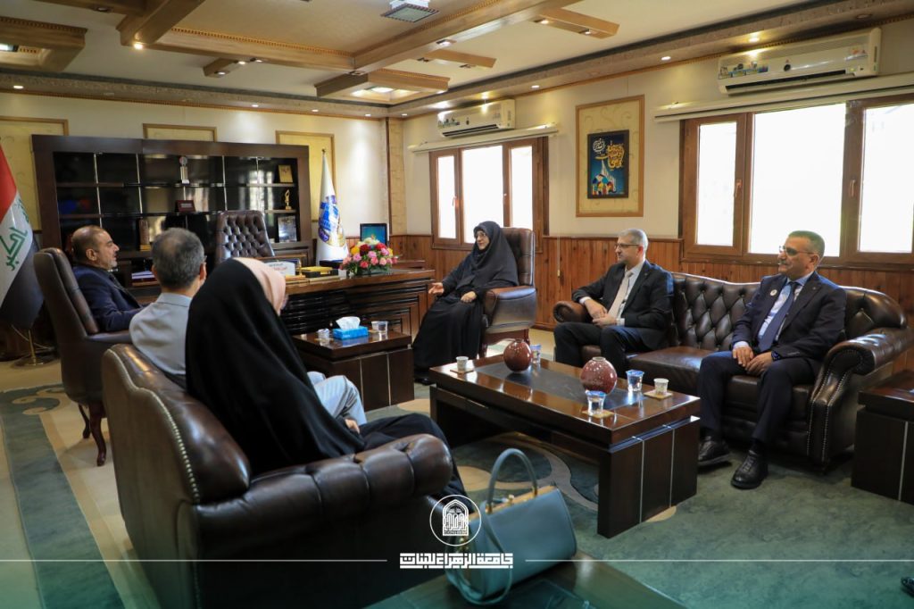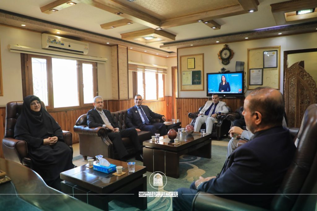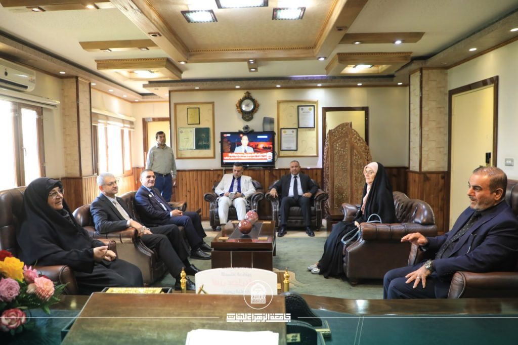 A delegation from Al-Zahraa University for women, headed by Prof. Dr. Zainab Al-Sultani, President of the University, accompanied by Prof. Dr. Zuhair Muhammad Jadou, Assistant for scientific affairs, Prof. Dr. Iman Samir Bahia, Dean of the Faculty of Education, Prof. Dr. Hassan Al-Qazzaz, Dean of the Faculty of Health and Medical Technologies, and representatives from the University’s media Department, visited the University of Babylon.